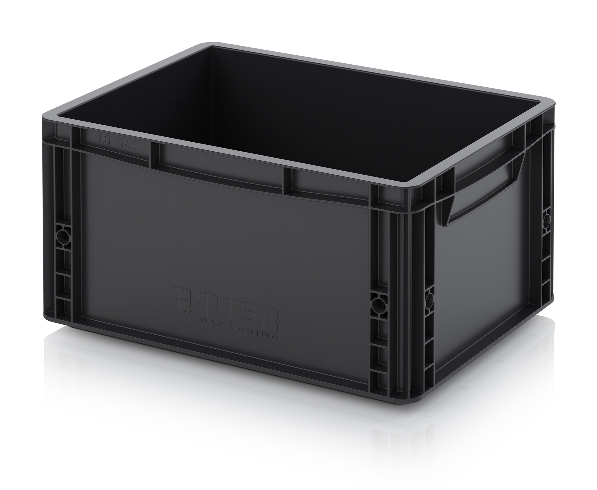 Евроконтейнер с ESD-защитой производства компании AUER Packaging изготавливается из антистатической пластмассы, что делает его пригодным, в частности, для надежного хранения и транспортировки электронной продукции.