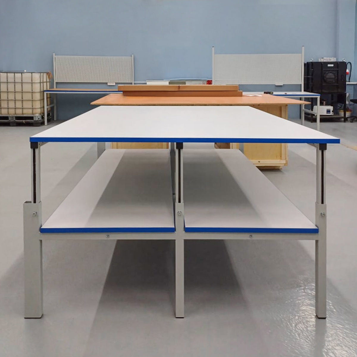 Модульная конструкция дает возможность оснастить раскройный стол дополнительным оборудованием: подвесными тумбами, перфорированными панелями, электропанелями, держателями рулонов, планкой для крепления лотков, освещением рабочей поверхности, угловым столом, ящиком для мелких принадлежностей, крючками для инструментов и другим дополнительным оборудованием и оснащением.